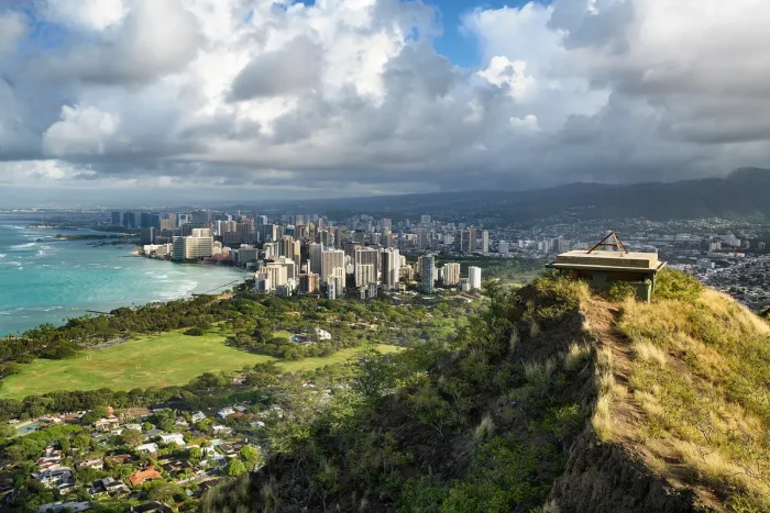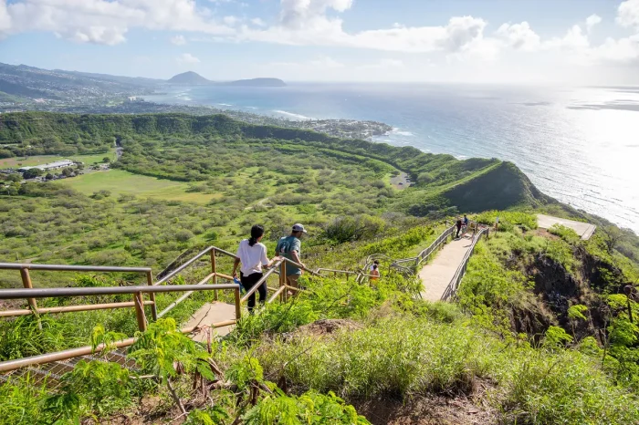 Le sentier menant au sommet de Diamond Head offre aux randonneurs des vues imprenables sur Waikiki et l’océan Pacifique. (Jeff Whyte/Shutterstock)