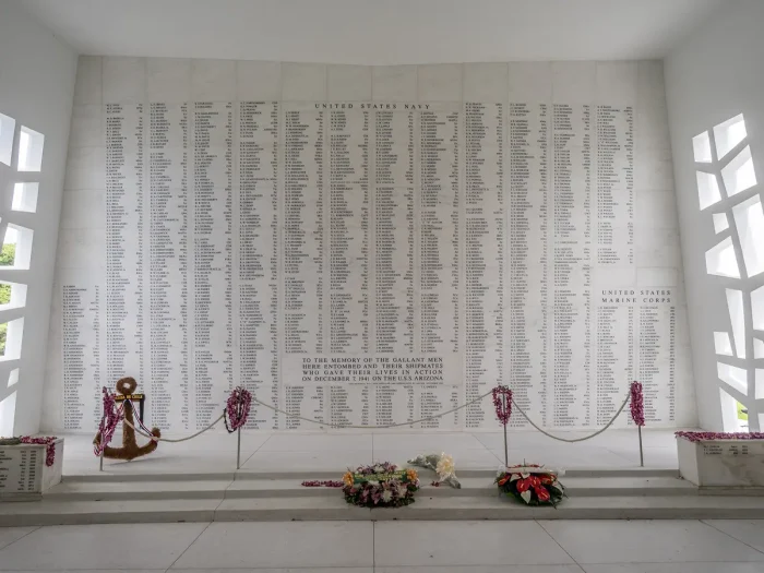 La visite du Pearl Harbor National Memorial demeure une expérience sobre et poignante. Après un film d’introduction, un bateau conduit les visiteurs jusqu’au site du USS Arizona, où périrent 1177 marins. Quatre bombes ont frappé le navire, dont une a fait exploser les munitions, déclenchant un incendie dévastateur. Environ 900 corps reposent encore dans l’épave, considérée comme une tombe marine.