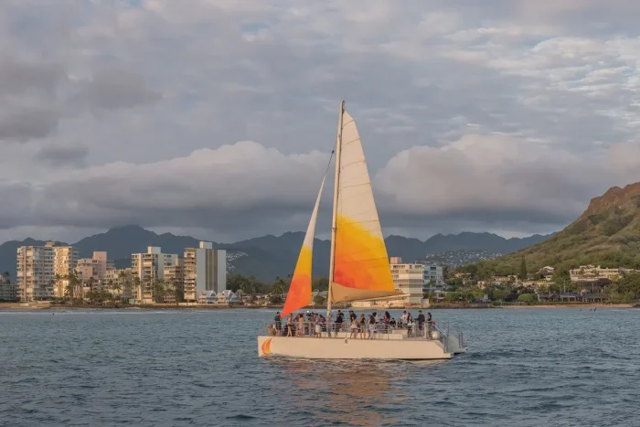 Les croisières en catamaran au coucher du soleil peuvent inclure de la musique en direct, des spectacles de hula ou des plats et boissons traditionnels hawaïens. (Theodore Trimmer/Shutterstock)