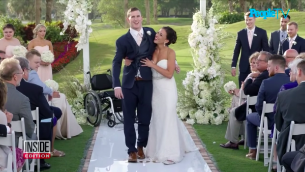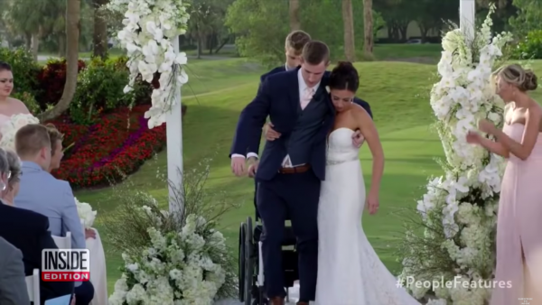 Le jour de son mariage, ce jeune homme de 26 ans a une fois de plus défié tous les pronostics de ses médecins. Dans son costume trois pièces bleu marine, Chris s’est levé de son fauteuil roulant et a marché au côté de sa femme jusqu’au bout de l’allée.