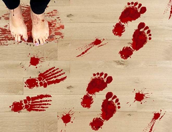 Un ensemble de 48 empreintes de pas ensanglantées et 15 taches de sang que vous pouvez coller sur n’importe quelle surface propre et lisse, et plus tard facilement enlever.