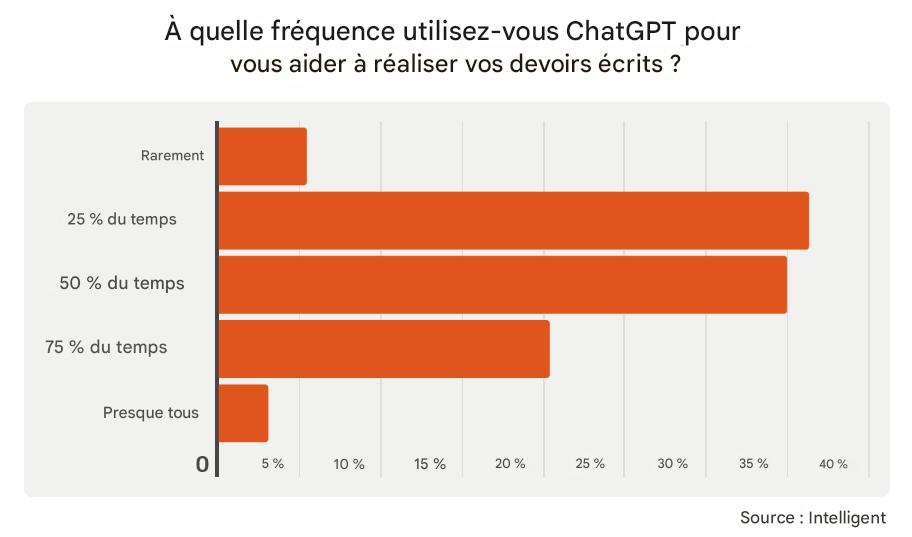 Selon une enquête menée en 2023 par le magazine en ligne Intelligent auprès de 1000 étudiants américains, près d’un tiers d’entre eux ont déclaré utiliser ChatGPT pour leurs devoirs, et près de 60 % l’ont utilisé pour plus de la moitié de leurs travaux. Le sondage a révélé que parmi ces étudiants, trois sur quatre estiment que c’est de la triche, mais utilisent quand même l’IA.