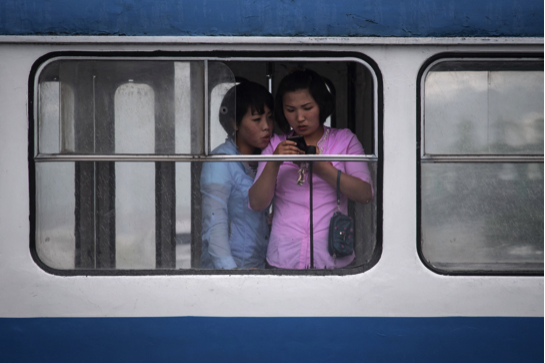 Sue cette photo prise le 6 juin 2017, deux femmes regardent un téléphone portable pendant leur trajet dans un tramway de Pyongyang. (ED JONES/AFP/Getty Images)