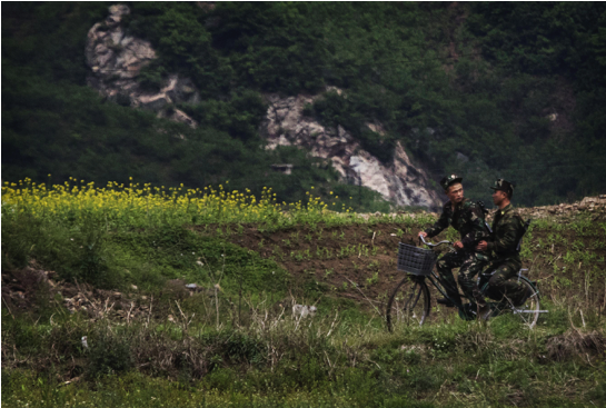 Des soldats nord-coréens à vélo, le long du fleuve Yalu, au nord de la ville frontalière de Sinuiju, le 23 mai 2017. (Kevin Frayer/Getty Images)