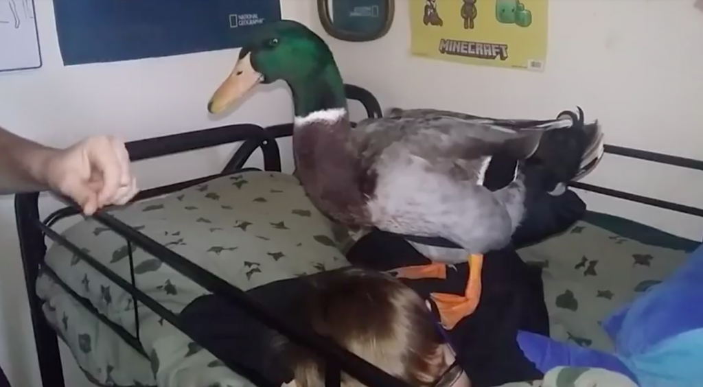 Ce canard ne voit pas d’un bon oeil la main qui touche le garçon endormi près de lui. Ce qu’il fait ensuite est vraiment drôle