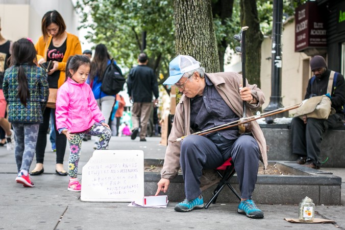 Une fillette fait un don au joueur de erhu, Xin Xiu, à Flushing, New York, le 29 septembre 2016. Les dons que Xin reçoit sont destinés aux avocats des droits de l’homme, emprisonnés en Chine. (Benjamin Chasteen/Epoch Times)
