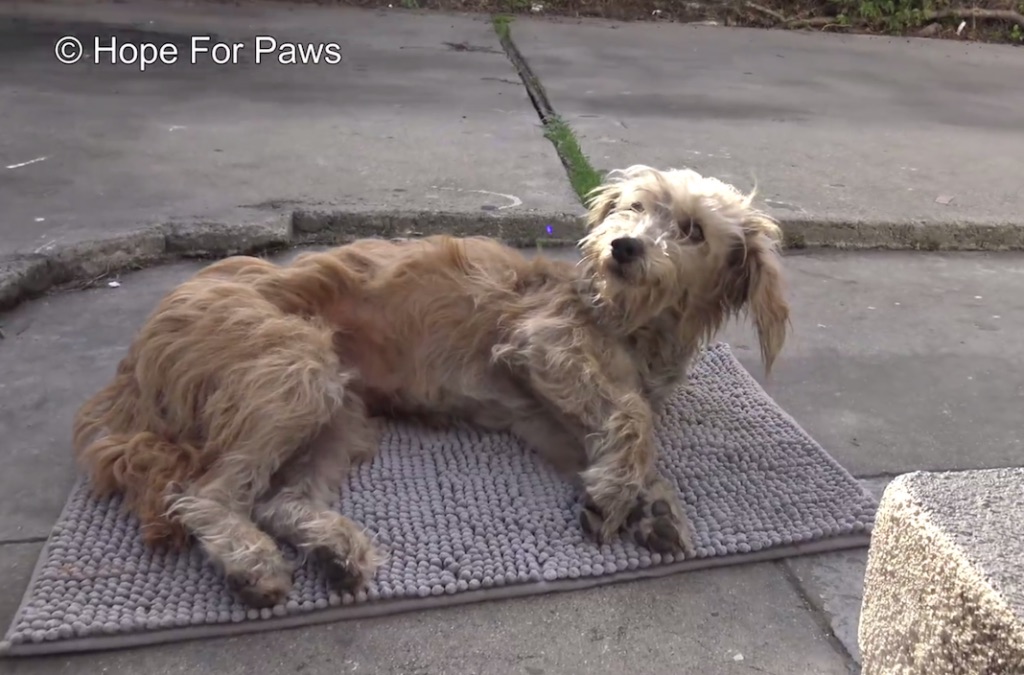 Un chien errant s’effondre dans une cour. Avec un peu d’amour, sa transformation est étonnante.
