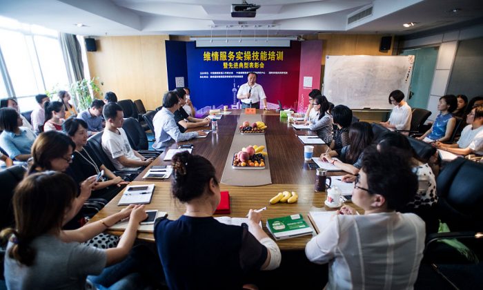 Shu Xin, le PDG de Weiqing, une entreprise qui propose toute une équipe de « chasseuses de maîtresses », s’adresse à ses collègues lors d’une réunion à Shanghai, le 8 juillet 2016. (Johannes Eisele / AFP / Getty Images)