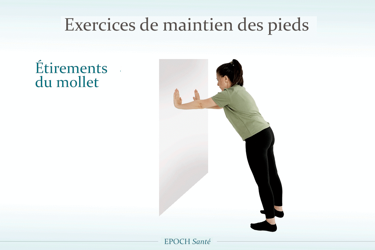 Étape 3 : placer les mains sur le mur et plier les bras avec précaution, en déplaçant la tête vers le mur, tout en gardant les pieds en place et le dos droit. Ne pas plier les genoux. On doit sentir un fort étirement à l’arrière du mollet droit.