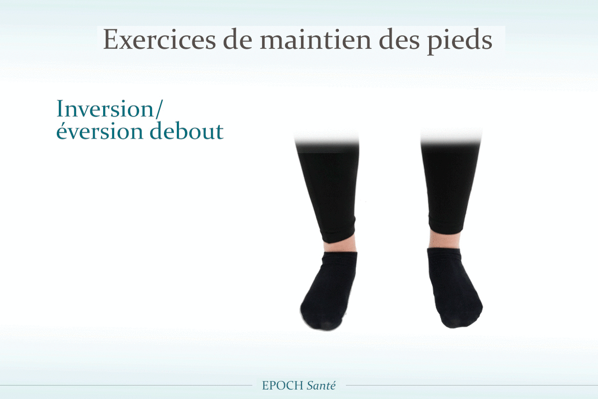 Étape 2 : rouler les deux pieds vers l’extérieur de façon à se tenir sur la face externe des pieds, une position connue sous le nom d’inversion. Maintenir cette position pendant environ 10 secondes.