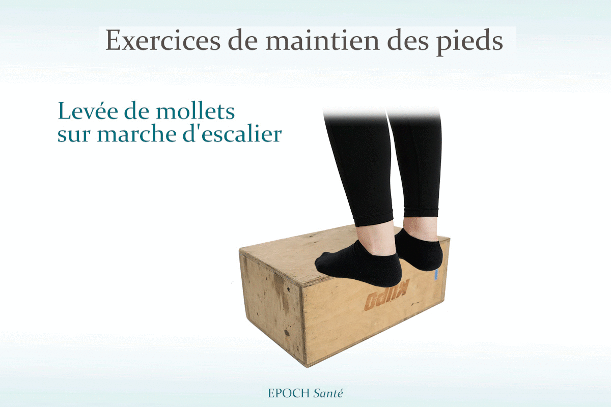 Les élévations des mollets en position debout qui ont été effectuées précédemment ont permis d’étirer les muscles gastrocnémiens et soléaires qui étaient tendus. Cet exercice aidera à les renforcer en les faisant bouger dans toute l’amplitude du mouvement tout en supportant le poids. Si on ne trouve pas d’escaliers, on peut utiliser un livre, une marche de yoga ou toute autre surface stable pour atteindre la hauteur nécessaire. Cette approche permet d’étirer et de renforcer les muscles, ce qui réduit le risque de déséquilibre musculaire et améliore la stabilité générale des jambes.