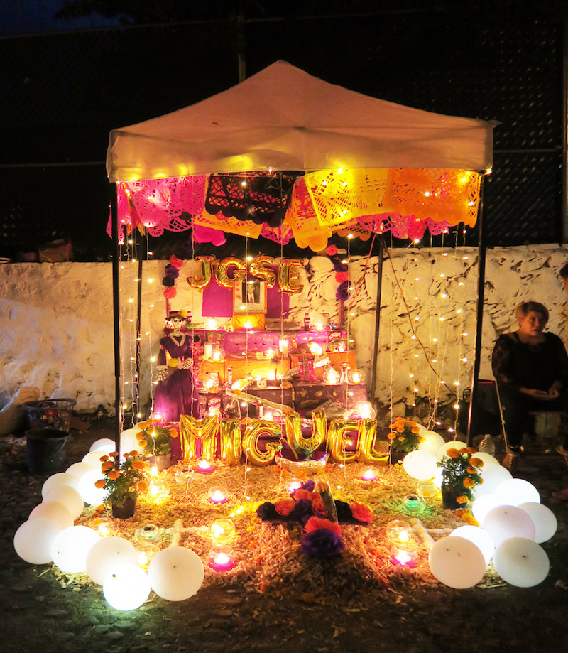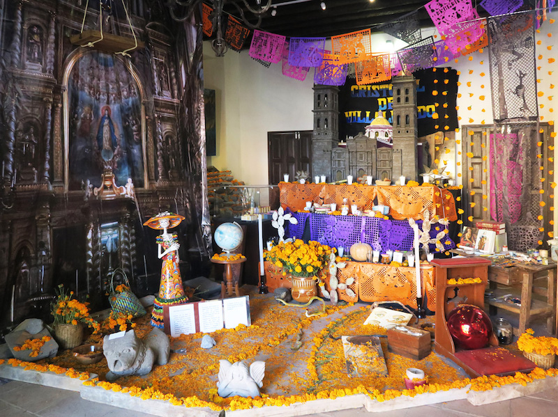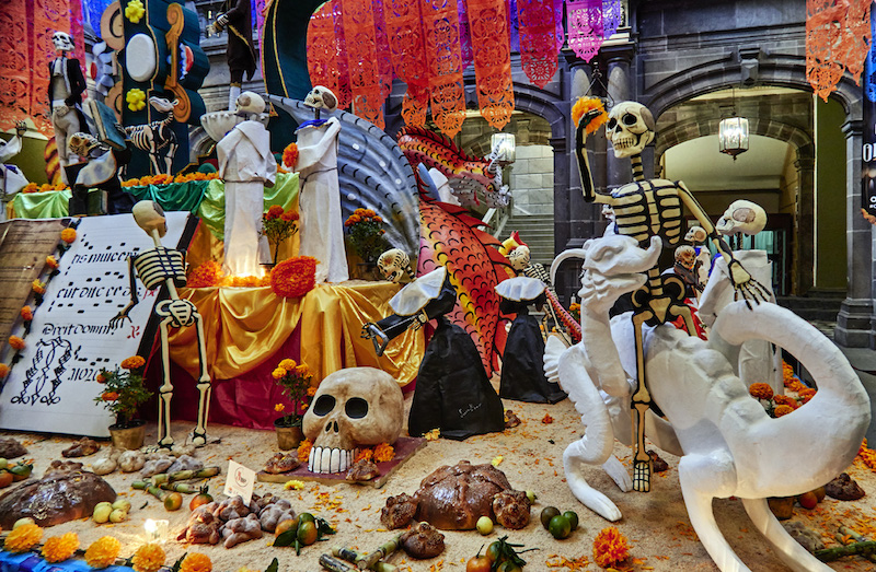 La coutume aztèque a perduré, seules les dates ont été modifiées pour concorder au calendrier catholique et aujourd’hui on fête les morts du 31 octobre au 2 novembre. Dans chaque foyer, sur les places et les marchés, dans les entrées de bâtiments publics et autour des tombes, des autels, des plus humbles aux plus imposants, sont dressés en souvenir des défunts. Leurs portraits sont entourés d’objets personnels qui leur étaient chers ainsi que de nourriture comme le pain des morts à savoir une brioche sucrée dont la forme symbolise un crâne, des courges confites, des têtes de mort en sucre coloré, des fruits mais aussi des boissons aussi diverses que du coca-cola, de la bière et de la tequila. L’ensemble est décoré de guirlandes de papel picado, à savoir du papier découpé en dessinant des motifs qui évoquent toujours la mort mais dont les couleurs vives roses, mauves et oranges racontent la joie de vivre.