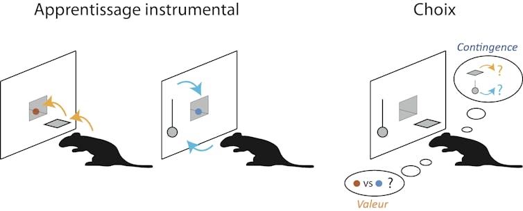 Le principe général repose sur un apprentissage dit « instrumental » : l’animal apprend que deux actions différentes (pousser un levier ou bien une tige métallique) permettent l’obtention de deux récompenses alimentaires distinctes qui leur sont spécifiquement associées. Il apprend également le lien causal entre le fait de réaliser l’action et ce qui en découle. Des manipulations spécifiques vont nous permettre d’étudier comment l’animal peut mettre à jour sa représentation de ces deux attributs, valeur de la récompense et lien causal entre l’action et son effet.