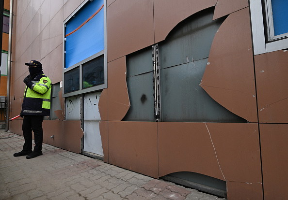 Un policier monte la garde à côté du mur endommagé du tribunal du district ouest de Séoul, le 20 janvier 2025, après que des partisans du Président sud-coréen Yoon Suk Yeol aient pris d’assaut le bâtiment le 19 janvier, après qu’un juge ait prolongé la détention du dirigeant mis en accusation pour sa tentative d’imposer la loi martiale. (Photo JUNG YEON-JE/AFP via Getty Images)