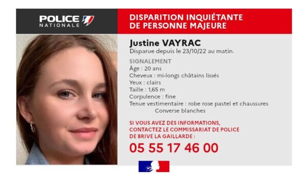 Justine Vayrac n’a plus été vue depuis dimanche matin, vers 04h00, près de la boîte de nuit « La Charrette » où elle passait la soirée, a expliqué la procureure Emilie Abrantes dans un communiqué.