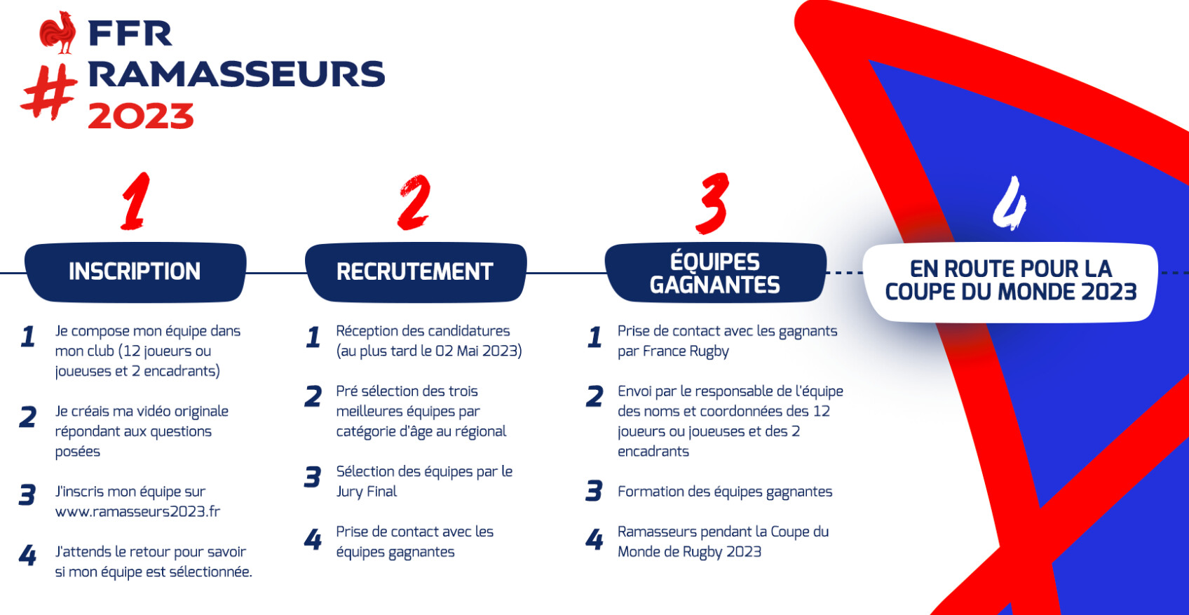 « La FFR offre l’opportunité unique pour des équipes masculine (M16 & M19) et féminine (M18) de clubs de Rugby de devenir ramasseurs de balles lors de la Coupe du Monde de Rugby 2023 en France. Un objectif pour le concours #Ramasseurs2023 : sélectionner les 48 équipes, composées chacune de 12 joueurs ou joueuses, licencié(e)s FFR et de 2 encadrants, et faire d’eux les ramasseurs de balles de la Coupe du Monde 2023 », a indiqué la FFR.