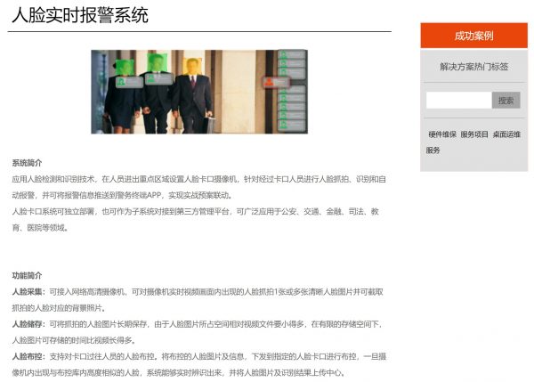 Capture d’écran du site internet PCI-Suntek Technology, une compagnie ayant fourni des systèmes de reconnaissance faciale et d’autres systèmes de surveillance de masse à Guangzhou et dans d’autres villes chinoises. Le site proclamant que le système gardait une « empreinte digitale » de tous les visages capturés pour les utiliser dans une identification postérieure, même si ceux-ci ne sont pas actuellement recherchés par les autorités.
