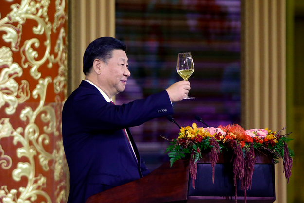 Le dirigeant chinois Xi Jinping porte un toast lors du dîner officiel au Grand palais du Peuple à Pékin, le 9 novembre 2017. (Thomas Peter – Pool / Getty Images)