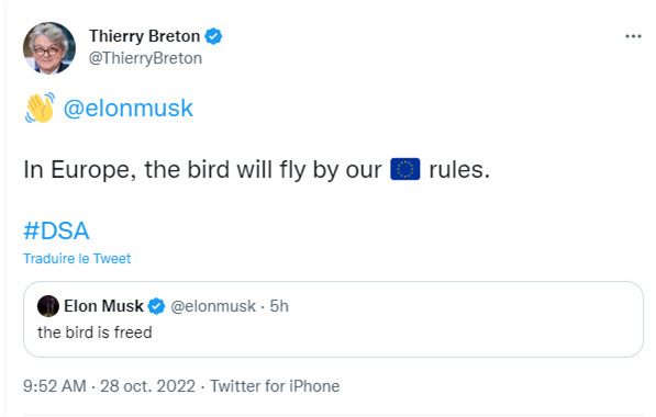 C’est un rôle qui semble inspirer Thierry Breton, notre commissaire européen au Marché intérieur. A peine Elon Musk a-t-il acheté Twitter et tweeté « The bird is free » (« L’oiseau est libre ») que Thierry Breton a réagi avec circonspection : « In Europe, the bird will fly by our rules » (« En Europe, l’oiseau volera selon nos règles »). Une mise en garde digne d’un commissaire politique.