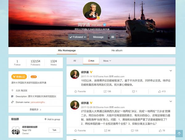 Capture d’écran de la page du site Weibo de l’expert chinois Yan Xuetong, qui partage régulièrement ses articles sur la politique étrangère de la Chine et les problèmes internationaux avec ses lecteurs chinois. (Capture d’écran de Weibo)