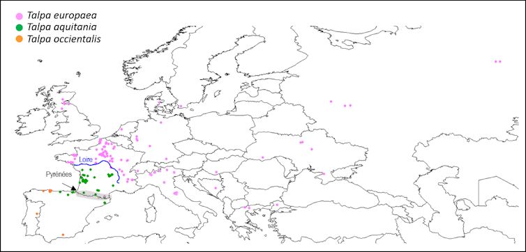 Nous avons récemment mené une étude approfondie sur la variabilité génétique et morphologique chez cette espèce et nous avons pu montrer que l’espèce T. europaea comprend en fait deux espèces cryptiques : T. europaea et une nouvelle espèce, que nous avons nommée T. aquitania. Ces deux espèces peuvent être distinguées du point de vue de leur ADN, mais aussi par plusieurs caractères morphologiques (taille du corps, yeux ouverts ou recouverts d’une membrane, caractères dentaires). A l’heure actuelle nos résultats montrent qu’elles présentent des aires de distribution différentes : T. europaea est présente en France depuis le Nord et l’Est de la Loire jusqu’en Russie, tandis que T. aquitania est présente en France au Sud et à l’Ouest de la Loire, jusqu’au Nord de l’Espagne. Une petite zone de contact entre ces espèces serait située dans l’est des Pyrénées. Il reste nécessaire d’étudier plus de spécimens d’Occitanie et d’intensifier notre échantillonnage de part et d’autre de la Loire afin de mieux comprendre quels facteurs limitent leurs aires de distribution.