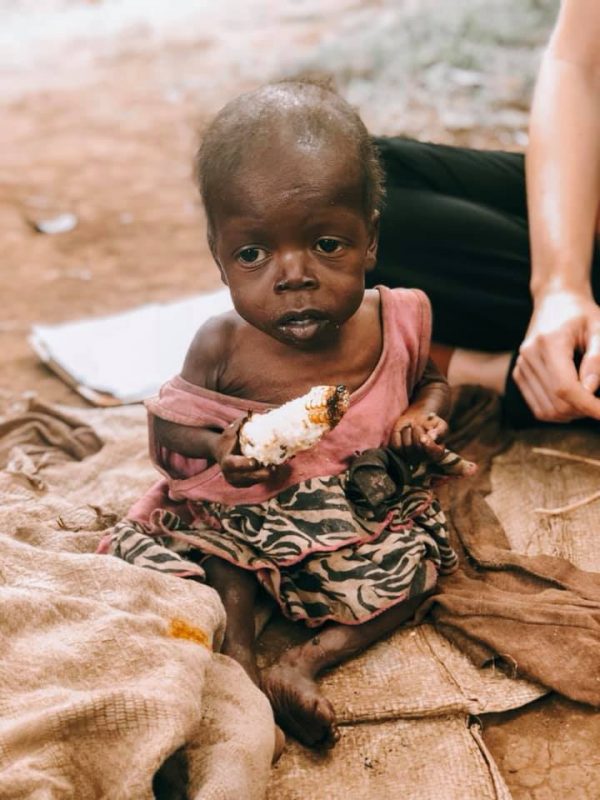 Dans la boue de la maison, un garçon nommé Sally, assis seul à l’avant, a attiré l’attention d’Amy. Le minuscule Sally de 9 ans, d’environ 4 kilos, portait une tenue rose déchirée, couverte de fourmis et de poussière. Dans ses petites mains, il tenait un épi de maïs couvert de sable.