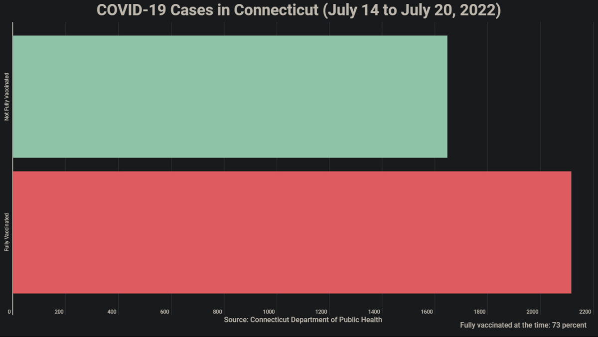 2/ Connecticut+ (14 juillet‑20 juillet) : 2116 infections perthérapeutiques (56%) ; (25 juillet) 63% d’hospitalisations suite à une infection perthérapeutique. Taux de la population entièrement vaccinée à l’époque : 73% ;