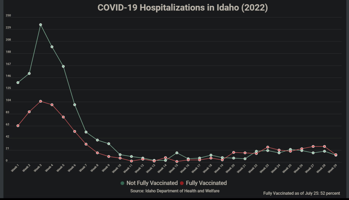 2/ Idaho+ (5 juin‑2 juillet) : 89 hospitalisations suite à une infection perthérapeutique (53% de toutes les hospitalisations Covid). Taux de la population entièrement vaccinée à l’époque : 52% ;