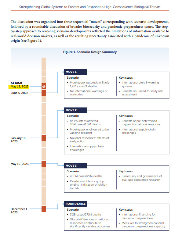 L’Event 201 a été organisé en octobre 2019 (deux mois avant que le coronavirus n’apparaisse à Wuhan) par la Fondation Bill-et-Melinda-Gates, le Forum économique mondial, Bloomberg et Johns Hopkins. Comme pour l’Event 201, les participants à la simulation Monkeypox ont jusqu’à présent gardé un silence de pierre quant à leur participation à une simulation de pandémie de variole du singe dont les faits deviennent réels quelques mois plus tard.
