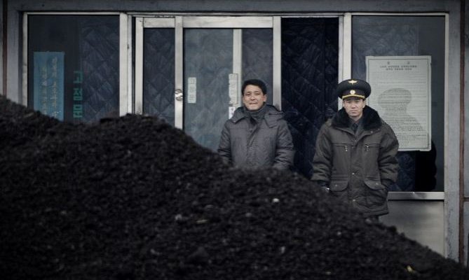 Un officier nord-coréen (d) avec un compatriote derrière un amas de charbon sur les rives du fleuve Yalu dans la ville frontalière nord-coréenne de Siniuju, le 14 décembre 2012. Le 18 février 2017, le ministère du Commerce chinois a annoncé la suspension des importations de charbon nord-coréen.