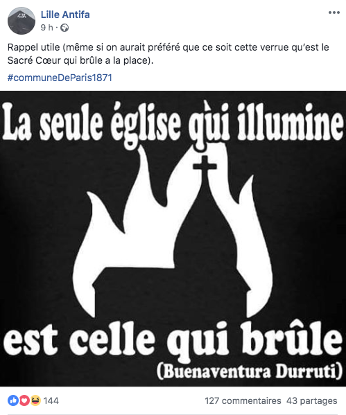 « La seule église qui illumine est celle qui brûle », pouvait-on notamment lire sur la page Facebook du groupe des antifas lillois. Un message accompagné du mot-dièse « CommunedeParis1871 », référence à l’insurrection sanglante qui embrasa la ville de Paris et pendant laquelle les Communards massacrèrent de nombreux Parisiens tout en détruisant des bâtiments publics et des œuvres d’art de grand prix.