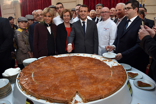 Le président français Emmanuel Macron et son épouse Brigitte ont découpé des tranches d’un gâteau épiphanie traditionnel lors d’une cérémonie à l’Elysée, le 12 janvier 2018 à Paris.(CHRISTOPHE ARCHAMBAULT/AFP/Getty Images)