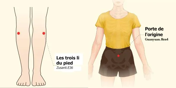 Acupression : stimulez le point Zusanli (situé à quatre largeurs de doigts sous le genou externe) pour améliorer la digestion et la motricité intestinale.