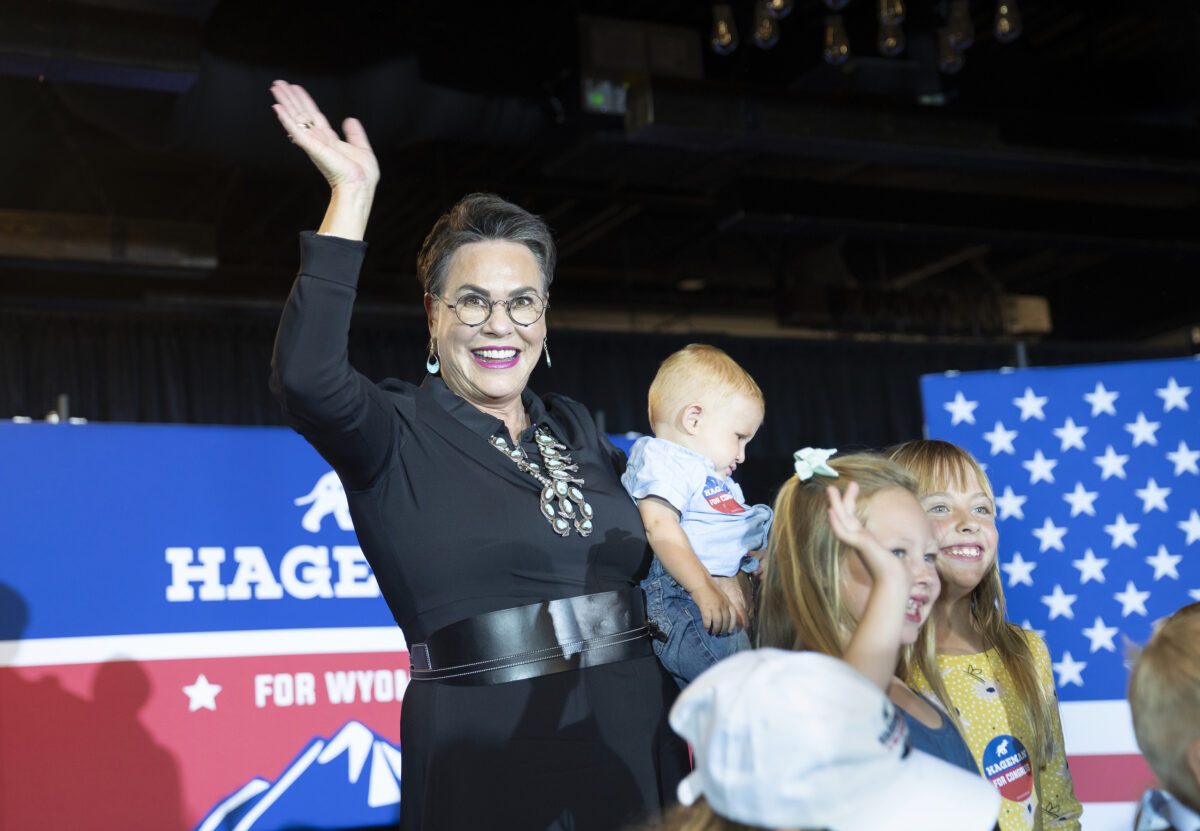 Harriet Hageman, candidate républicaine au Congrès du Wyoming, salue les enfants lors d’une fête organisée le soir des élections primaires à Cheyenne, dans le Wyoming, le 16 août 2022. (Michael Smith/Getty Images)