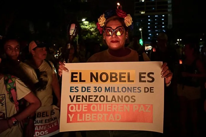 Une manifestante brandit une banderole proclamant : « Le prix Nobel appartient aux 30 millions de Vénézuéliens qui aspirent à la paix et à la liberté », le 6 décembre 2025, à Panama. (MARTIN BERNETTI / AFP via Getty Images)
