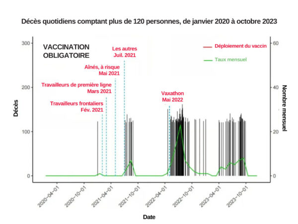 Cette surmortalité coïncide avec le déploiement du programme de vaccination. La thérapie génique à base d’ARNm a été offerte à la population, soit deux millions de personnes, à partir de juillet 2021.