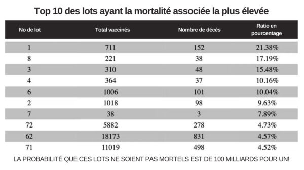 Les décès enregistrés par vaccinateur suggèrent que les vaccinateurs (ou les lots qu’ils utilisent) [modulent] le risque [de décès], le nombre de décès par vaccinateur pouvant atteindre 25% des personnes vaccinées.