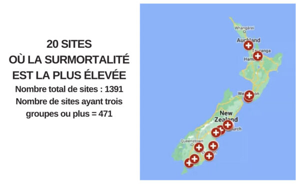 Parmi les 20 sites où la surmortalité est la plus élevée, sept se trouvent dans la ville de Christchurch, une ville universitaire de 380.000 habitants.