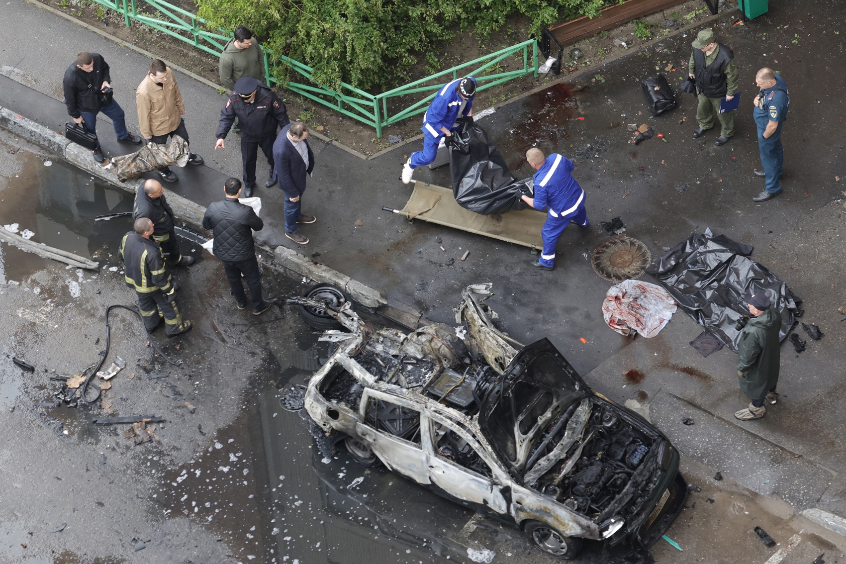 Des employés des services funéraires transportent le corps d’une personne tuée sur une civière tandis que des agents des forces de l’ordre russes travaillent à côté d’une voiture détruite dans la cour d’un immeuble résidentiel à la suite d’une explosion à Balashikha, dans la région de Moscou, le 25 avril 2025. (TATYANA MAKEYEVA/AFP via Getty Images)