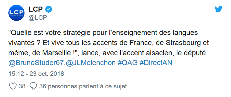 « Vive l’Alsace, vive la République et tous les accents de France, de Strasbourg et même de Marseille », a conclu le député du Bas-Rhin. « Merci de ce moment glottophile », a répondu Richard Ferrand, le président de l’Assemblée nationale. Auparavant, Jacques Cattin, député des Républicains du Haut-Rhin, avait lui aussi posé avec un fort accent une question sur les travailleurs saisonniers.