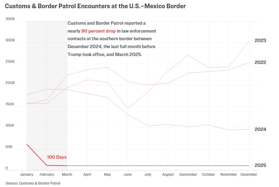 Le service des douanes et de la protection des frontières a signalé une baisse de près de 90 % des arrestations d’immigrants illégaux à la frontière sud entre décembre 2024 – le dernier mois complet avant l’entrée en fonction de M. Trump – et mars 2024.