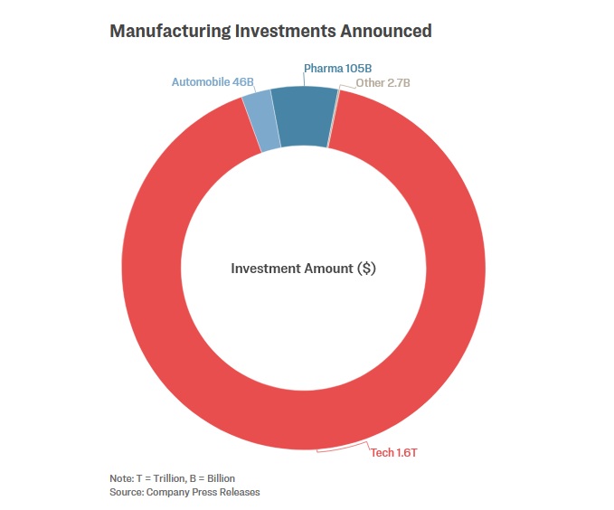 Ces investissements comprennent plus de 1000 milliards de dollars (880 milliards d’euros) de la part des géants de la technologie (Nvidia, Apple, Oracle, etc.). Merck, l’entreprise pharmaceutique allemande, a ouvert cette année un site de production d’un milliard de dollars en Caroline du Nord.