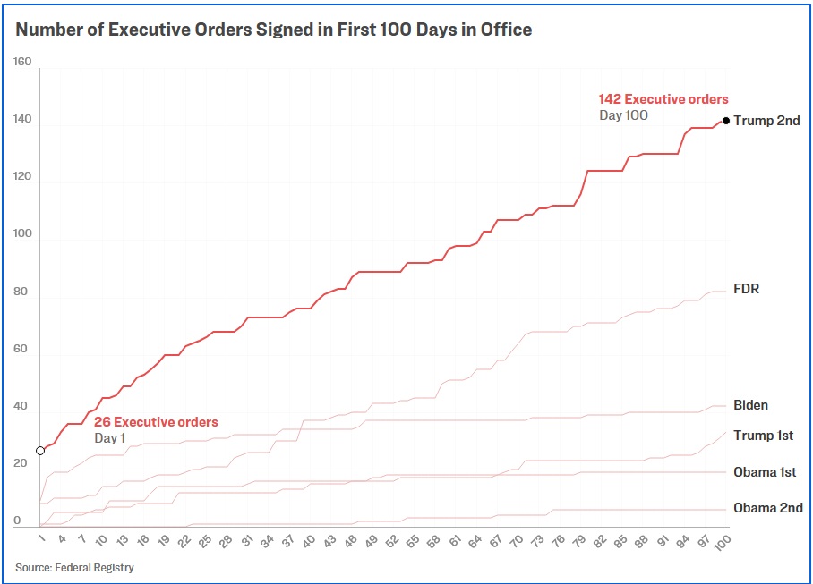 Pendant la campagne, M. Trump avait promis une mise en œuvre rapide de son programme, et il l’a fait. Le nouveau président a signé 142 décrets au cours de ses 100 premiers jours, dont 26 dès le premier jour de son mandat.