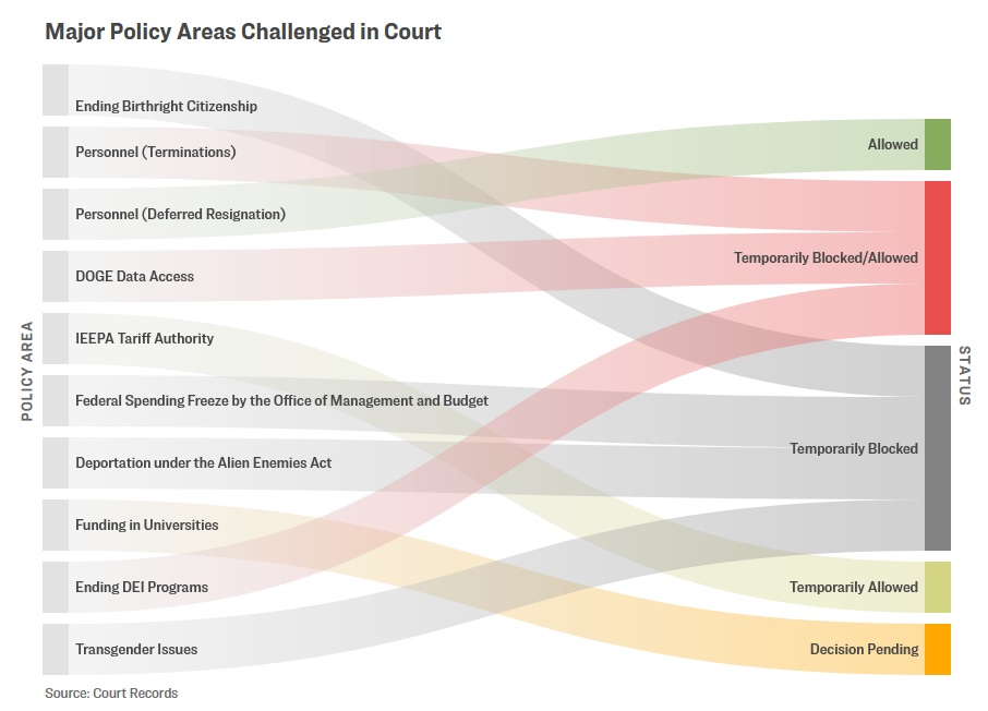 La quasi-totalité des recours juridiques sont en cours d’examen par les tribunaux. Certaines des mesures prises par le président Trump ont été bloquées ou autorisées temporairement, dans l’attente d’une nouvelle action en justice. Le tribunal a autorisé la poursuite du programme de démission différée, ou plan de départ volontaire, du ministère de l’efficacité gouvernementale (DOGE). La contestation judiciaire de l’université de Harvard concernant le gel du financement de l’administration pour cause d’antisémitisme et la suppression des programmes de diversité, d’équité et d’inclusion (DEI) n’a pas encore été entendue par le tribunal.