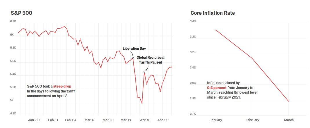 L’indice S&P 500, qui suit les performances des principales entreprises, a fortement chuté dans les jours qui ont suivi l’annonce des droits de douane. Les prix se sont redressés le 8 avril, le lendemain de l’annonce par M. Trump d’une pause dans la mise en œuvre de nombreux tarifs douaniers.
