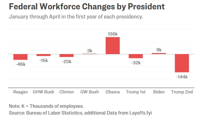 Trois autres présidents récents avaient procédé à d’importantes réductions de personnel au cours de leurs 100 premiers jours, tout comme l’a fait M. Trump au cours de son premier mandat.