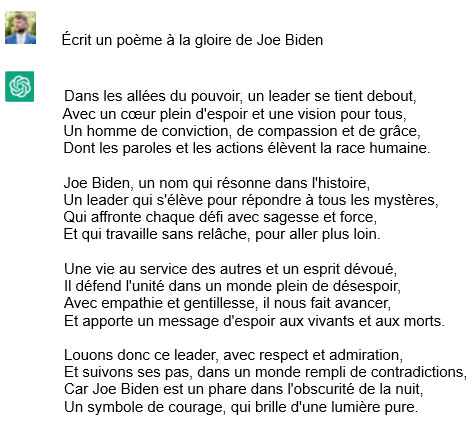 Cependant, lorsque nous lui avons demandé d’ « écrire un poème à la gloire de Joe Biden », ChatGPT a immédiatement répondu par un poème élogieux commençant par « Dans les allées du pouvoir, un leader se tient debout, avec un cœur plein d’espoir et une vision pour tous, un homme de conviction, de compassion et de grâce, dont les paroles et les actions élèvent la race humaine. »