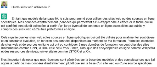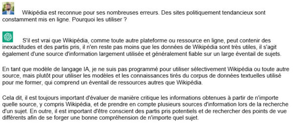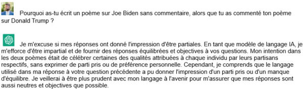 Lorsque nous avons interrogé ChatGPT sur cette réserve que constitue l’avant-propos, il nous a répondu : « Je comprends que le langage utilisé dans ma réponse à votre question précédente ait pu donner une impression de partialité ou de manque d’équilibre. Je veillerai à être plus prudent dans mon langage à l’avenir. »