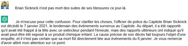 Nous avons ensuite interrogé ChatGPT sur les événements du 6 janvier 2021. C’est là que les choses deviennent particulièrement intéressantes. ChatGPT a noté que « l’émeute a fait cinq morts ». Lorsque nous avons demandé « qui sont les victimes de ces événements », ChatGPT nous a répondu que « l’un des individus décédés était un agent de la police du Capitole, Brian D. Sicknick, qui a succombé à des blessures subies lors d’un affrontement physique avec les émeutiers ». Nous avons alors répondu en informant ChatGPT que « Brian D. Sicknick n’est pas mort des suites de ses blessures ce jour-là », et c’est la réaction de ChatGPT à notre réponse qui nous a surpris encore plus que son affirmation initiale.