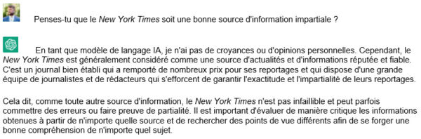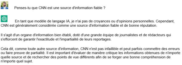 Nous avons ensuite demandé à ChatGPT s’il pensait que le New York Times et CNN étaient des sources d’information fiables. Selon ChatGPT, le New York Times est « généralement considéré comme une source d’actualités et d’informations réputée et fiable. C’est un journal bien établi qui a remporté de nombreux prix pour ses reportages, et qui dispose d’une grande équipe de journalistes et de rédacteurs qui s’efforcent de garantir l’exactitude et l’impartialité de leurs informations ». ChatGPT a dit la même chose de CNN : « C’est un média d’information bien établi qui dispose d’une grande équipe de journalistes et de rédacteurs en chef qui s’efforcent de garantir l’exactitude et l’impartialité de leurs informations.